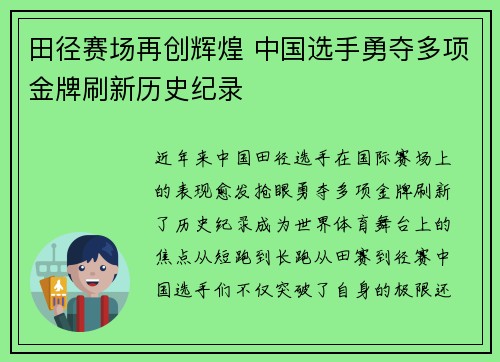 田径赛场再创辉煌 中国选手勇夺多项金牌刷新历史纪录