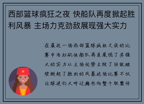 西部篮球疯狂之夜 快船队再度掀起胜利风暴 主场力克劲敌展现强大实力