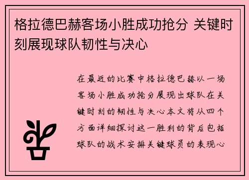 在最近的比赛中,格拉德巴赫以一场客场小胜成功抢分,展现出球队在关键时刻的韧性与决心。本文将从四个方面详细探讨这一胜利的背后,包括球队的战术安排、关键球员的表现、心理素质的提升以及教练的战术智慧。每个方面都将深入分析,揭示格拉德巴赫在困境中如何逆转局势,取得宝贵的分数。这场比赛不仅体现了球队的实力,更展现了他们在逆境中的坚定信念和不屈精神,值得所有球迷的赞赏。